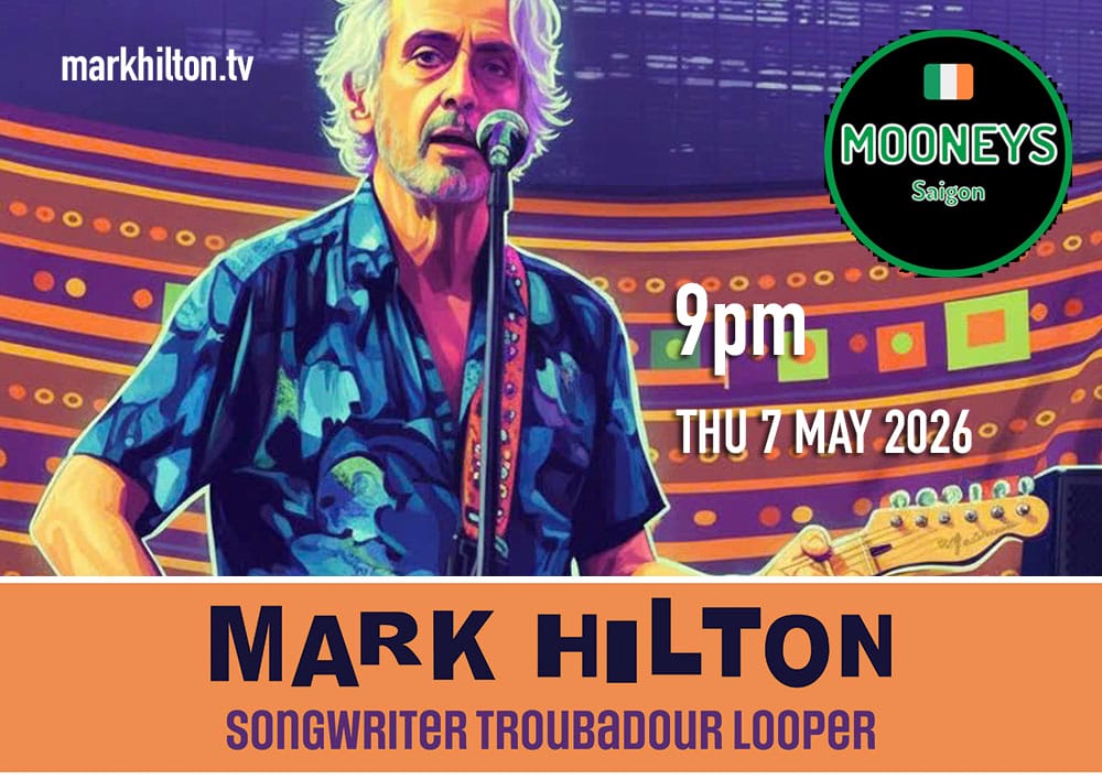 SOLO at Mooneys Saigon SOLO GIG at Mooneys Saigon Hẻm 40 Bùi Viện, Phường Phạm Ngũ Lão, Bến Thành, Hồ Chí Minh, VietnamTHU 7 May, 2026 ~ 9pm Posted in Gigs, News and tagged acoustic, acoustic guitar, acoustic music, australian songwriter, bluegrass, blues, bohemia, bossa nova, calypso, country blues, fado, mark hilton, rapper, rhumba, singer songwriter, urban folk, urban poet