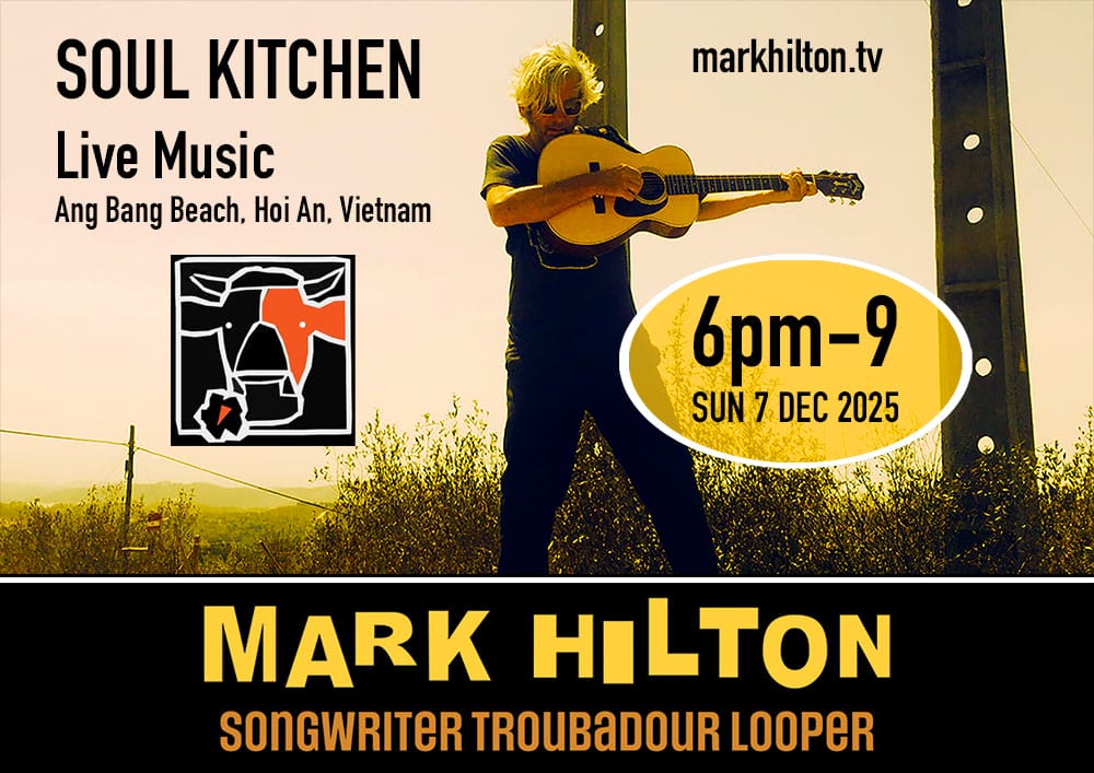SOLO at SOUL KITCHEN SOLO GIG at Soul Kitchen, An Bang Beach, Hoi An, Vietnam SUNDAY 7 December, 2025 ~ 6pm-9 Posted in Gigs, News and tagged acoustic, acoustic guitar, acoustic music, appalachian music, australian songwriter, bluegrass, blues, bossa nova, calypso, country blues, fado, hillbilly trance, hip-hop, mark hilton, ranchero, rhumba, samba, singer songwriter, urban folk